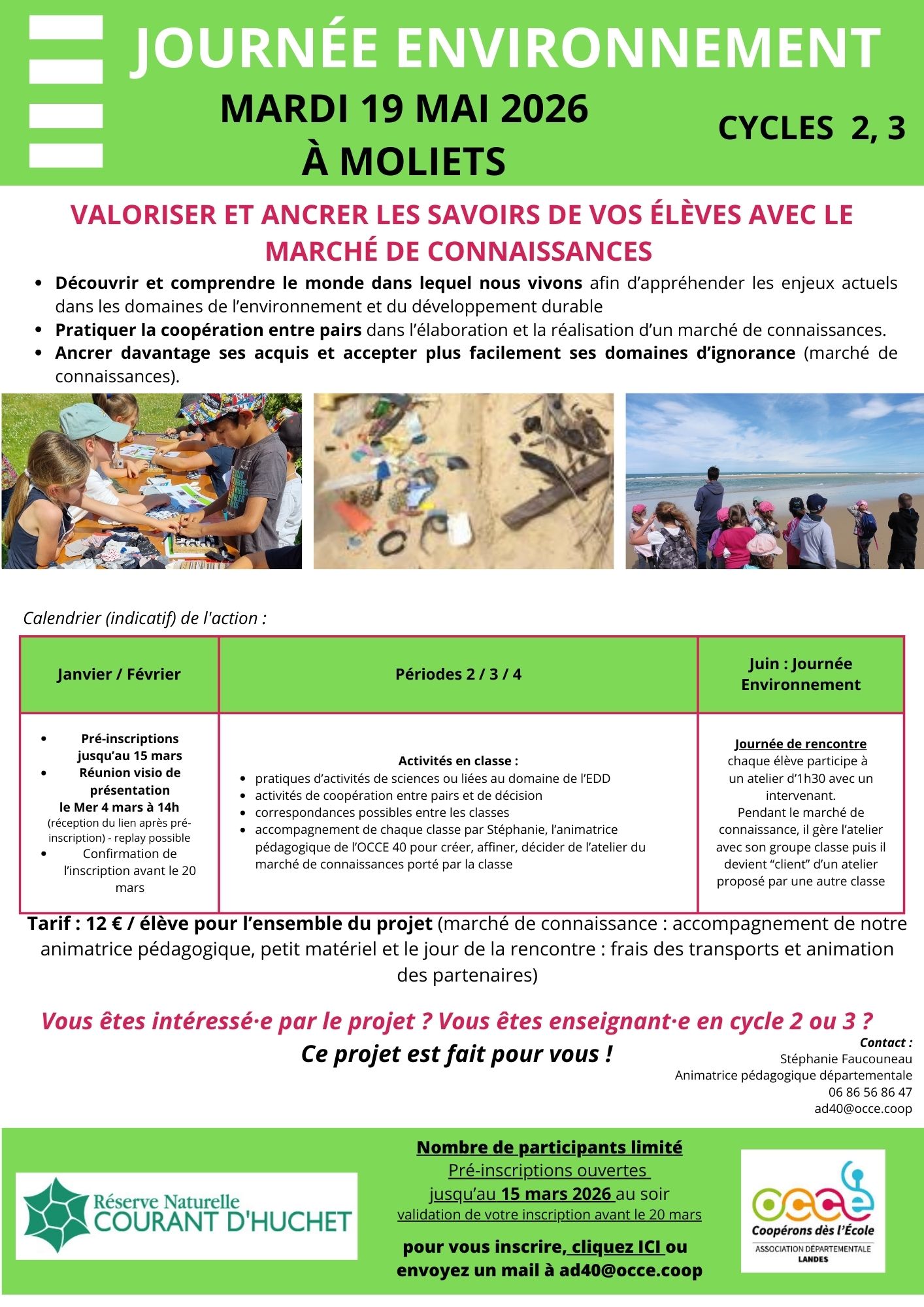 L'équipe de l'OCCE 40 vous propose une Journées Environnement au plus près de vos projets et de la pédagogie coopérative.