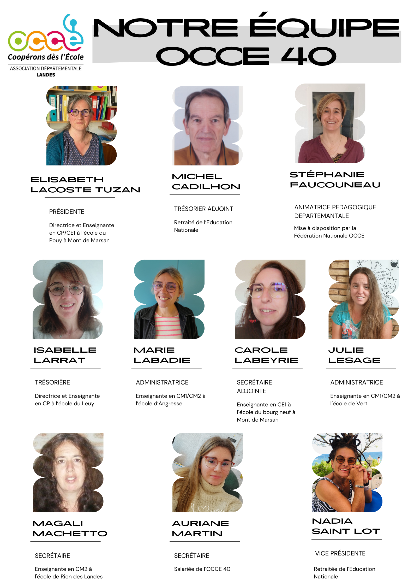 Nous, administrateurs de l’AD40 vous saluons et vous invitons à nous rejoindre pour augmenter la richesse et la variété des projets pédagogiques coopératifs en cours et à venir.